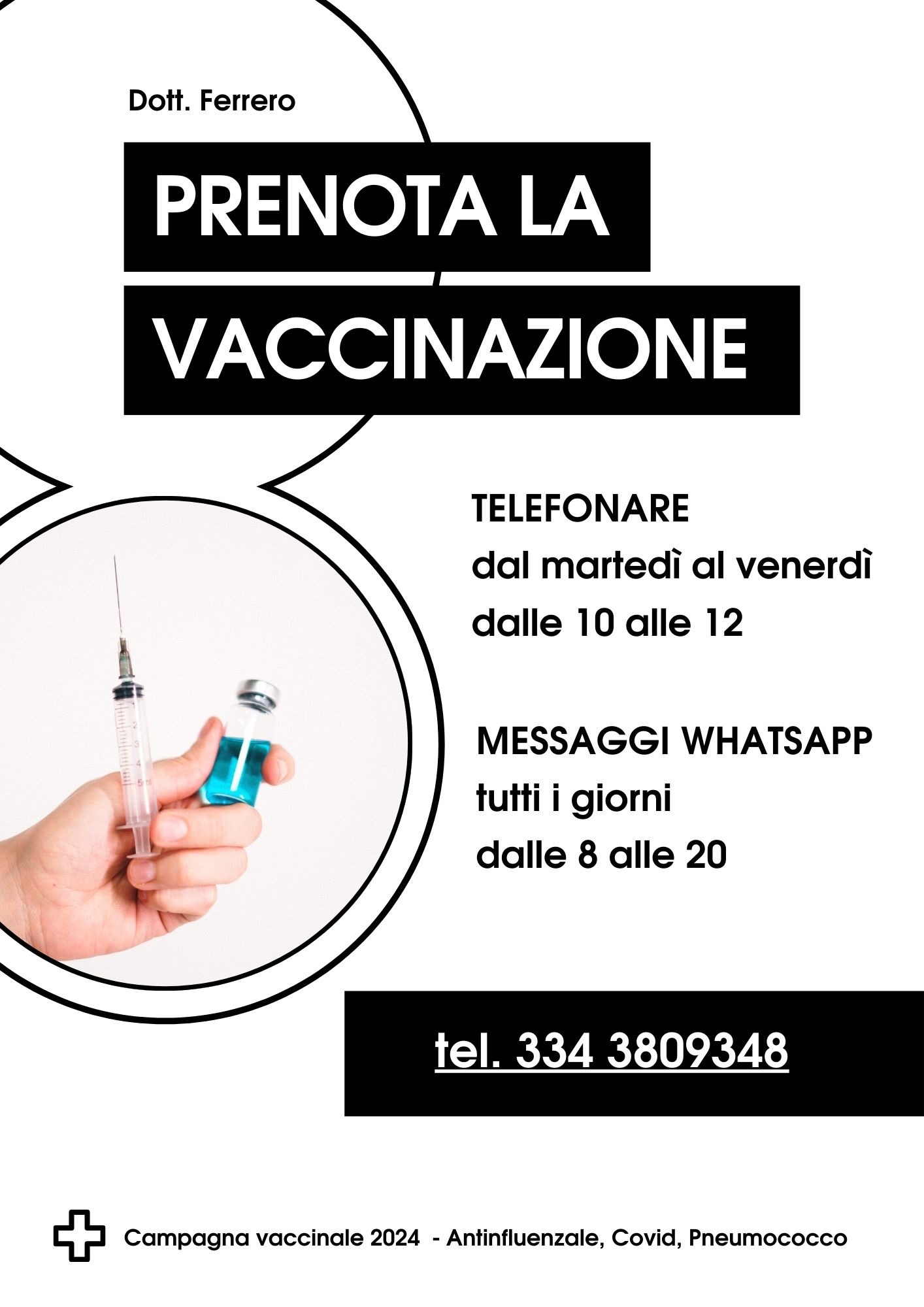 Prenota la vaccinazione presso il Dr. Ferrero telefonando dal martedì al venerdì dalle 10.00 alle 12.00 e tramite messaggi whatsapp tutti i giorni dalle 8.00 alle 20.00 al 334 3809348
